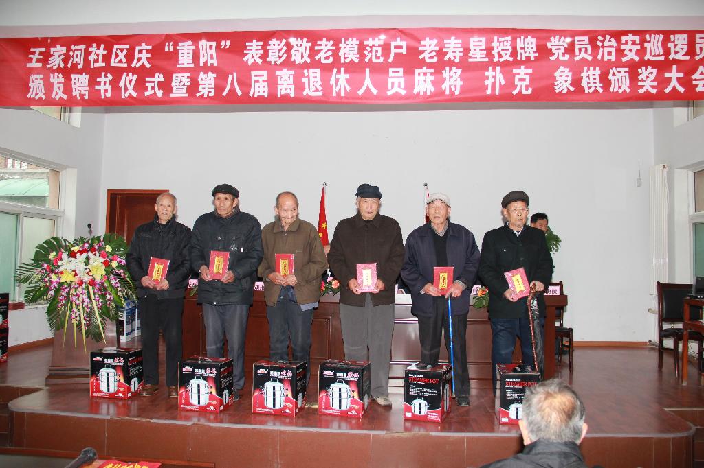 王家河社區(qū)主任張學(xué)海代表社區(qū)全體員工對(duì)敬老模范戶、老壽星們表達(dá)了親切的問候和衷心的祝愿。希望年輕一代永遠(yuǎn)學(xué)習(xí)老一輩的閱歷和經(jīng)驗(yàn),為創(chuàng)和諧社區(qū)邁上新的臺(tái)階。同時(shí),會(huì)上對(duì)8戶“敬老模范戶”、13名“老壽星”及社區(qū)義務(wù)治安巡邏隊(duì)進(jìn)行了表彰。并為第八屆退休職工棋牌賽三個(gè)地區(qū)的前三名分別頒發(fā)聘書及頒獎(jiǎng)儀式。