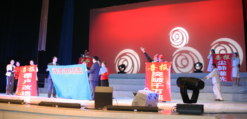桃園社區(qū)的歡慶鑼鼓——《銅煤贊》揭開(kāi)了演出的序幕。來(lái)自陜北綏德歌舞團(tuán)的舞蹈《金嗩吶》,展示了黃土高原青年男女對(duì)幸福生活的向往和追求;民歌手雒潔演唱的陜北民歌《三十里鋪》,聲情并茂,仿佛把我們帶到了黃土高原那片遼闊的土地;我省秦腔名家李小峰的清唱《打柴勸弟》、《三滴血》激昂、高亢,唱功名不虛傳,不斷贏(yíng)來(lái)熱烈的掌聲。由我國(guó)著名演員劉遠(yuǎn)、蔣瑞征表演的小品《辦公室的故事》,歌頌了我局領(lǐng)導(dǎo)一心為民、替民分憂(yōu)的公仆精神。由著名相聲表演藝術(shù)家侯耀文的關(guān)門(mén)弟子魏元成、趙魏明合說(shuō)的相聲《樓上樓下》,語(yǔ)言幽默,詼諧,令人捧腹;陜西歌舞團(tuán)的著名歌唱家仵曉蘭演唱的歌曲《感恩》、《兒行千里》抒發(fā)了母親對(duì)兒子的那份牽掛和兒子時(shí)刻牢記母親的養(yǎng)育之恩,他滿(mǎn)含深情的演唱感動(dòng)了在場(chǎng)所有的觀(guān)眾。