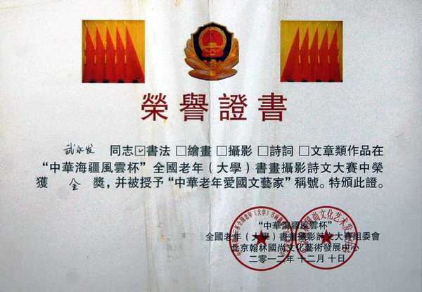 據(jù)悉,中華海疆風(fēng)云杯全國老年大學(xué)書畫攝影詩文大賽,是為了慶祝黨的十八大召開,聲援祖國海疆,展示全國中老年人的愛國熱情和文藝才華,由北京翰林國尚文化藝術(shù)發(fā)展中心與中國書畫報(bào)等有關(guān)文化部門共同組織“中華海疆風(fēng)云杯”全國老年(大學(xué))詩文書畫攝影文藝大賽活動(dòng)。這次大賽涉及全國各個(gè)省市,參加人員之廣,參評作品達(dá)29萬件之多。大賽組委會(huì)特邀專家評委,堅(jiān)持公平、公正、公開的原則,從書法、繪畫、攝影、詩詞、文章中,針對作品的書體、內(nèi)容、章法、功底、自創(chuàng)、習(xí)作、題款、用印、視覺等方面,從初審、復(fù)審的基礎(chǔ)上評出各類別的金獎(jiǎng)50名,金華山礦黨委書記武永發(fā)書法作品,是由銅川市老年大學(xué)推薦評選的,他的作品以筆酣墨飽、筆走龍蛇,具有于右任草書風(fēng)格而獲得金獎(jiǎng),作品并被收錄中國當(dāng)代老年大學(xué)書畫攝影詩文大賽優(yōu)秀作品大典一書。