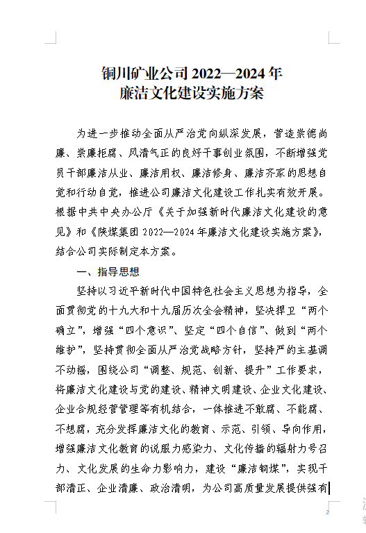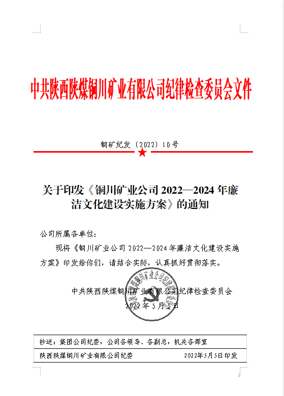 關(guān)于印發(fā)《銅川礦業(yè)公司2022—2024年廉潔文化建設(shè)實(shí)施方案》的通知