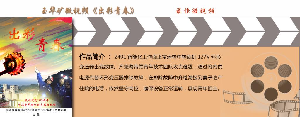 微視頻《出彩青春》生動講述了玉華礦2401智能化工作面轉(zhuǎn)載機(jī)127V環(huán)形變壓器出現(xiàn)故障后,綜采隊(duì)隊(duì)長齊繼海帶領(lǐng)青年技術(shù)團(tuán)隊(duì)現(xiàn)場排查處理,故障排除中齊繼海接到妻子臨產(chǎn)住院電話后,依然堅(jiān)守崗位,完成任務(wù),確保設(shè)備正常運(yùn)轉(zhuǎn)的故事,生動展示了礦井優(yōu)秀青年崗位建功、舍小家顧大家的情懷擔(dān)當(dāng),獲得了“最佳微視頻”。