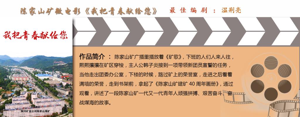 陳家山礦微電影《我把青春獻(xiàn)給您》以公司涌現(xiàn)的“全國煤炭工業(yè)勞動模范”康紅牛、何萬明,“全國煤礦建功立業(yè)優(yōu)秀大學(xué)畢業(yè)生”韓奇為原型,講述了陳家山礦一代代青年頑強(qiáng)拼搏、艱苦奮斗、鏖戰(zhàn)煤海的故事,摘得“最佳編劇”獎(jiǎng)。