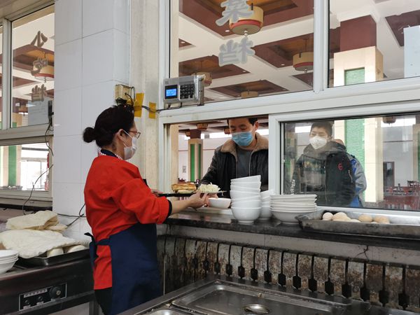 在食堂大廳,她們及時(shí)提醒大家做好個(gè)人防護(hù),保持1.5米排隊(duì)距離,吃飯前在摘下口罩,還為取餐的職工提供打包服務(wù),取完即走,有效減少人員聚集。