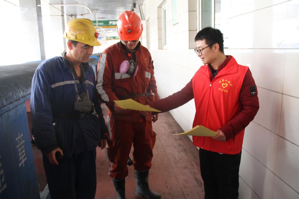 12月10日一大早,陳家山礦青年志愿者們就已經(jīng)開始行動了,他們穿上紅馬甲,帶著彩色的宣傳單在區(qū)隊學(xué)習(xí)室、礦井口人車場等候著一線的礦工兄弟們。