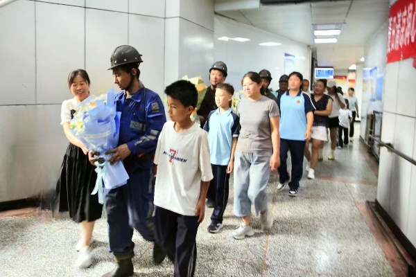 井口洋溢著溫馨的氣息,職工子女們手捧鮮花與蛋糕,在井口安全區(qū)翹首等待父親升井。“爸爸辛苦了!”當職工們踏出井口,孩子們飛奔上前獻花擁抱,現(xiàn)場響起陣陣掌聲。孩子們用童言稚語表達著對父親安全的關切與期盼,真摯的情感讓硬漢們也為之動容。該礦職工南師傅說:“孩子到井口來接我,這份感動比任何禮物都珍貴!”隨后家屬們?yōu)槁毠に蜕硝r花,全家攜手一起合影,用鏡頭定格團圓時刻。這一刻,親情與責任交織,凝聚成“安全生產(chǎn)、幸福相伴”的集體共鳴。